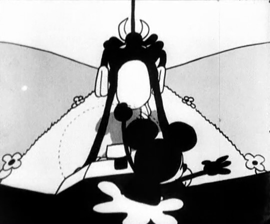 The whole barnyard pitches in to build Mickey a rubber-dog-powered airplane, but it explodes immediately, so he sticks a propeller and a turkey tail on a jalopy to get some real power. After terrorizing everyone during takeoff, including some sweet first-person views that might account for this movie being on Jerry Beck’s list, he gets Minnie in the air in order to sexually harass her, but she ditches him mid-flight.