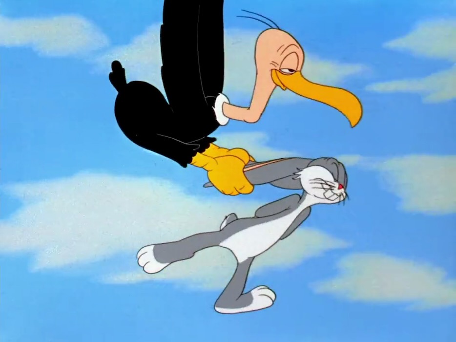 Now a well-established character, Bugs faces off against a dim vulture (condor?), the bird version of Elmer. The buzzard’s voice was a parody of a well-known ventriloquist dummy, created by Edgar “father of Candice” Bergen, whose other well-known ventriloquist dummy was parodied in Mother Goose Goes Hollywood.